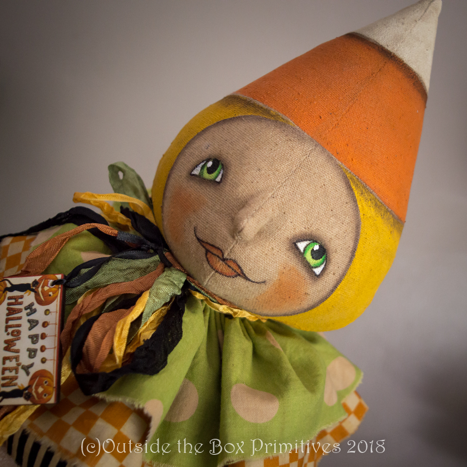 made of fabric from my original design (c), then fully hand painted and detailed. Wooden post card with vintage image " Happy Halloween". Wooden candlestick, silk ribbon,lampwork glass candy corns on black chain.